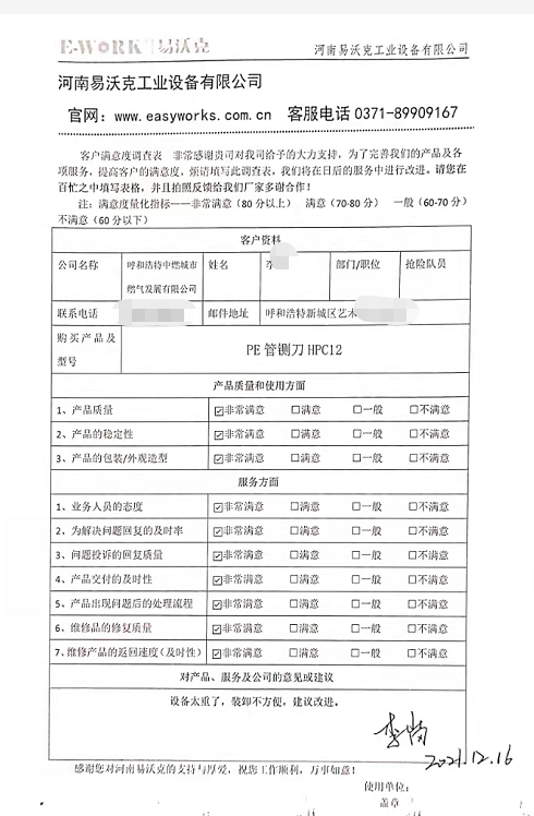當(dāng)月呼和浩特中燃公司收到易沃克PE管鍘刀后立即開始現(xiàn)場燃?xì)釶E管切割搶修現(xiàn)場,現(xiàn)場工人師傅反饋使用后贊不絕口,這個(gè)易沃克廠家的PE管鍘刀質(zhì)量和效率真不錯(cuò),十多分鐘就可以帶氣切割大大提供現(xiàn)場搶修PE管切割時(shí)間,而且燃?xì)夤艿缼釶E管切割操作,現(xiàn)場師傅說前幾年一直用的美國進(jìn)口PE管鍘刀,想不到我們國產(chǎn)易沃克PE管鍘刀效果這樣好我們易沃克廠家的售后服務(wù)團(tuán)隊(duì)跟蹤一直在跟進(jìn)使用效果以及現(xiàn)場視頻免費(fèi)技術(shù)指導(dǎo),下面是燃?xì)夤艿垃F(xiàn)場PE管鍘刀使用效果反饋圖 和售后的服務(wù)評價(jià)表