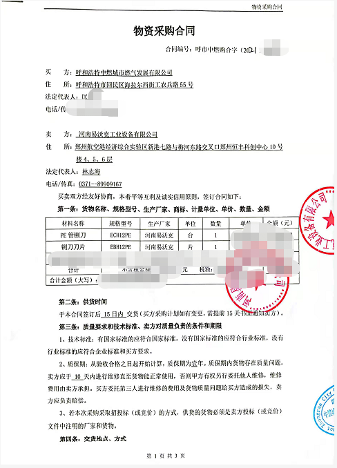 2021年10月份呼和浩特中燃燃?xì)饧瘓F(tuán)有限公司采購?fù)踅?jīng)理與我們河南易沃克工業(yè)設(shè)備有限公司業(yè)務(wù)員進(jìn)行電話溝通洽談了解易沃克產(chǎn)品主要服務(wù)于燃?xì)?、石油石化現(xiàn)場管道搶修、手動(dòng)防爆冷切割刀、PE管止氣封堵、PE管鍘刀和PE管刮皮刀等搶修設(shè)備比較感興趣,經(jīng)過多次電話溝通確認(rèn)易沃克廠家產(chǎn)品比較符合中燃燃?xì)猬F(xiàn)場PE管切割搶修,在10月8號兩家公司簽訂PE管鍘刀采購合同。